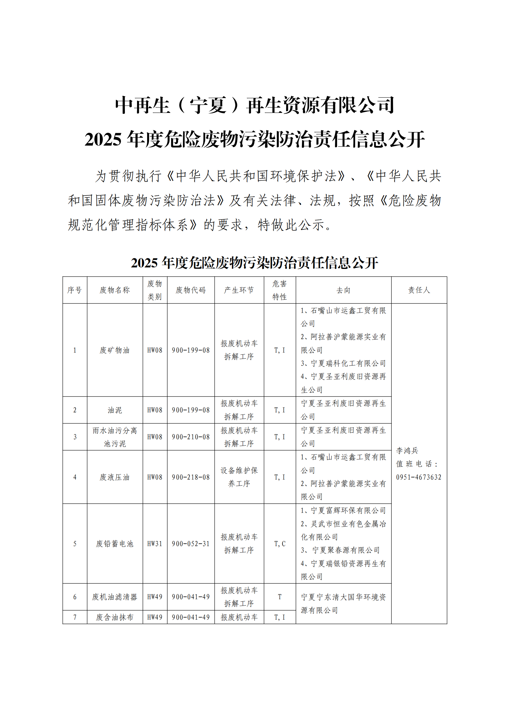 2025年度危险废物污染防治责任信息