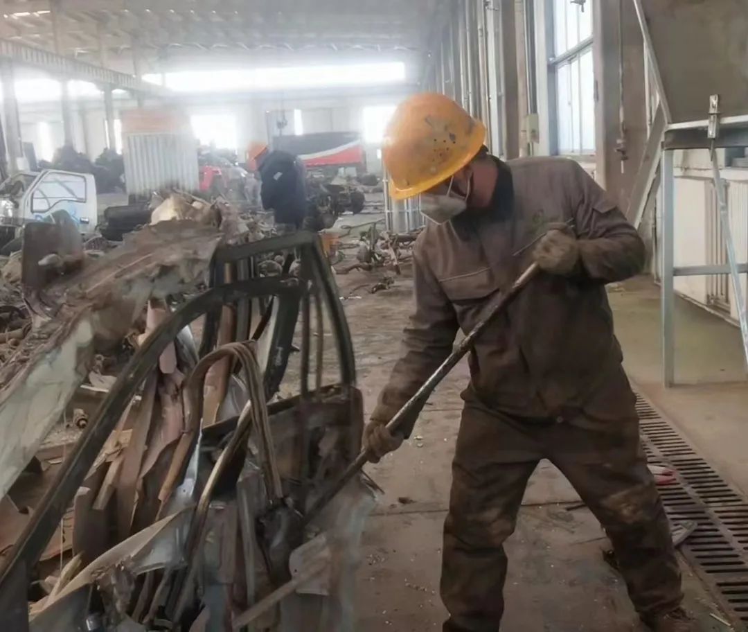 拆解车间,职工正对废旧汽车进行粗拆,让它们在“变废为宝”的路上走出第一步。