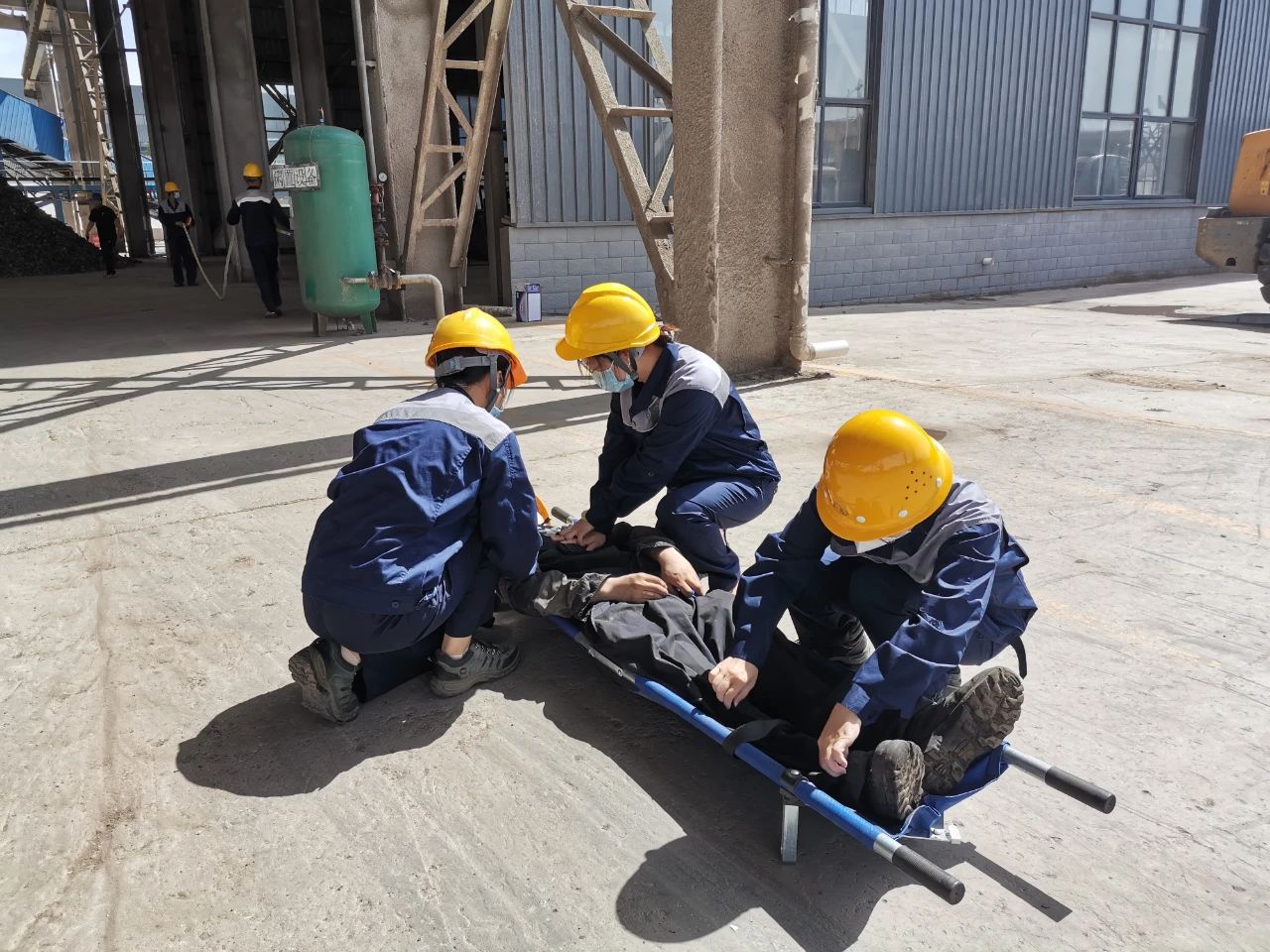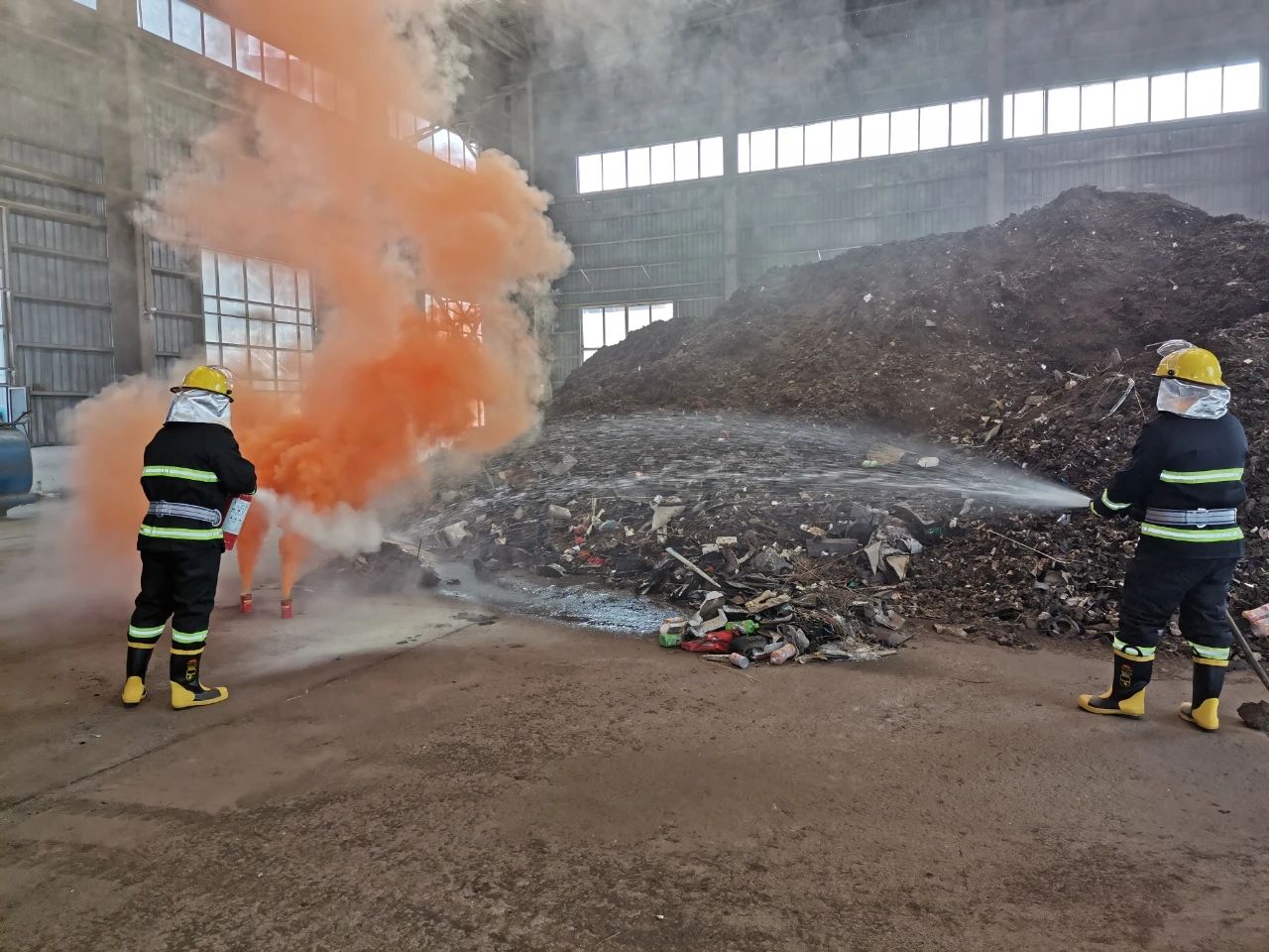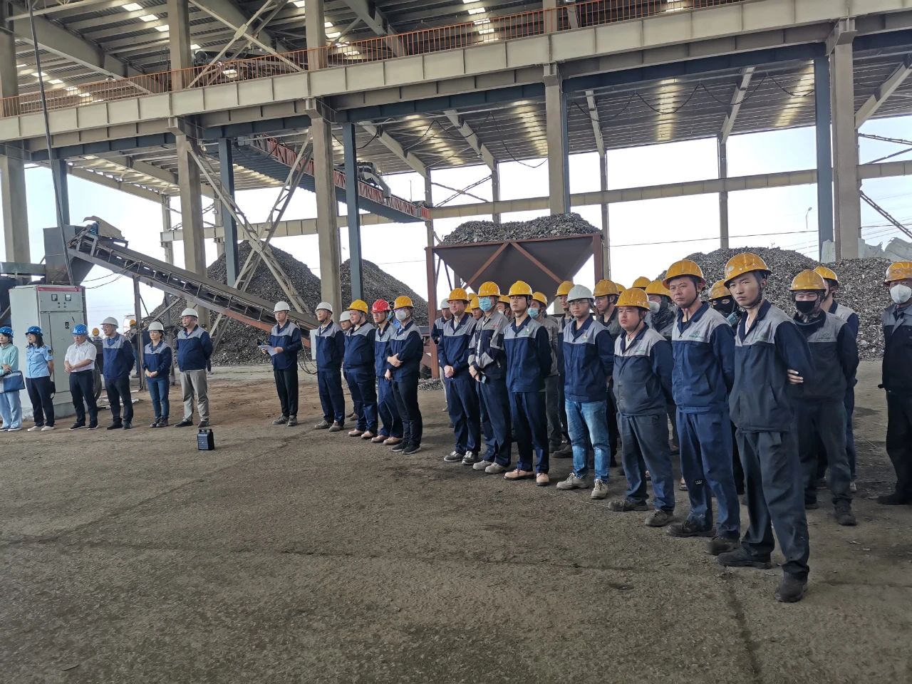此次演练模拟公司有色分选厂房内,维修工利用叉车对有色分选厂房的应急水箱泵进行维修,叉车作业过程中由于尾部没有安装防火罩在作业过程中火星引燃废钢破碎尾料,随即产生大量浓烟。维修工立即启动叉车进行逃生,发现叉车因故障无法正常启动,随即跳下叉车进行逃生,逃生过程中吸入大量浓烟导致昏迷,大量堆积的废钢破碎尾料随时可能发生燃烧、爆炸的风险。生产部门首先启动处置方案展开自救,公司在接到报告后,立即启动公司级生产安全事故应急救援预案和突发环境事件应急预案,组织实施救援。
